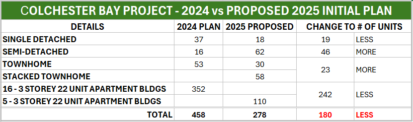After a contentious start in 2024, the Developer of the proposed Subdivision called Colchester Bay has submitted a preliminary plan for a much revised version of the project indicating a unit reduction of 42% overall.